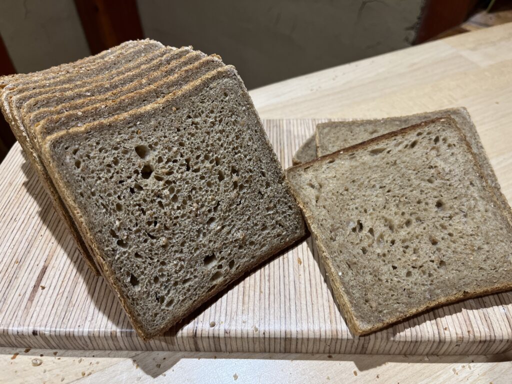 Farine bise d’engrain sur meule de pierre, panification au levain naturel de petit épeautre, disponible en pains moulés de 500grs ou 750 grs.